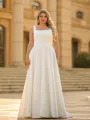 This plus size A-line wedding dress features a chic square neckline and sleeveless design, crafted from luxurious satin. The pleated skirt flows gracefully into a court train, while the A-line silhouette creates a flattering and elegant bridal look.