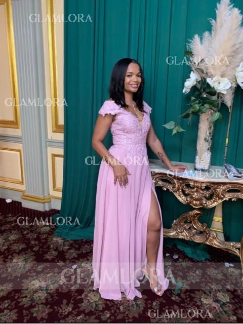 Chic A-line chiffon bridesmaid dress with a V-neckline and delicate cap sleeves adorned with appliques lace. The floor-length hem adds an elegant flair to the design.