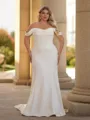 This plus size sheath wedding dress features an off-the-shoulder neckline with a sleeveless design. The fitted corset bodice enhances the figure, while the pleated satin skirt flows into an elegant court train, creating a sophisticated and flattering bridal look.